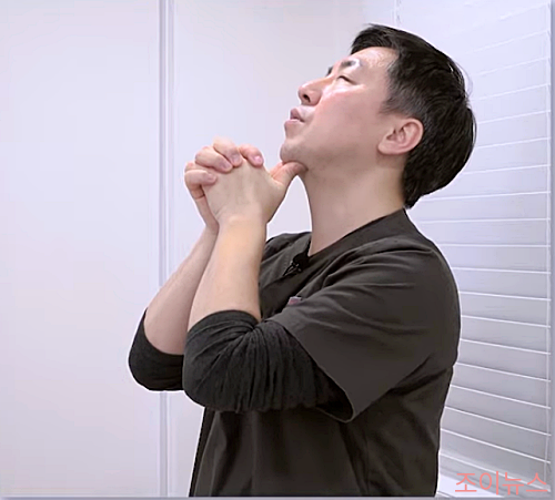 깍지 낀 손의 양쪽 엄지손가락으로 턱 아래를 받쳐줍니다. 그 상태로 목을 천천히 뒤로 젖힙니다.