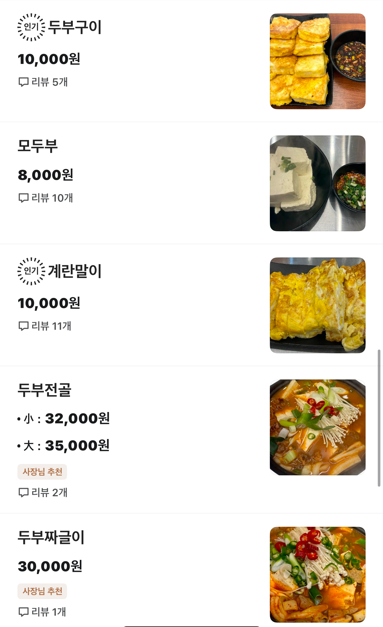 저는 샘물순두부에서 두부전골, 두부조림, 제육볶음, 짜글이, 계란말이, 두부구이를 먹어봤어요. 딱! 어떤 메뉴를 추천드리기 어려운 게 각 메뉴가 갖는 특성이 다르면서도, 매력이 있어서 고민이 됩니다.